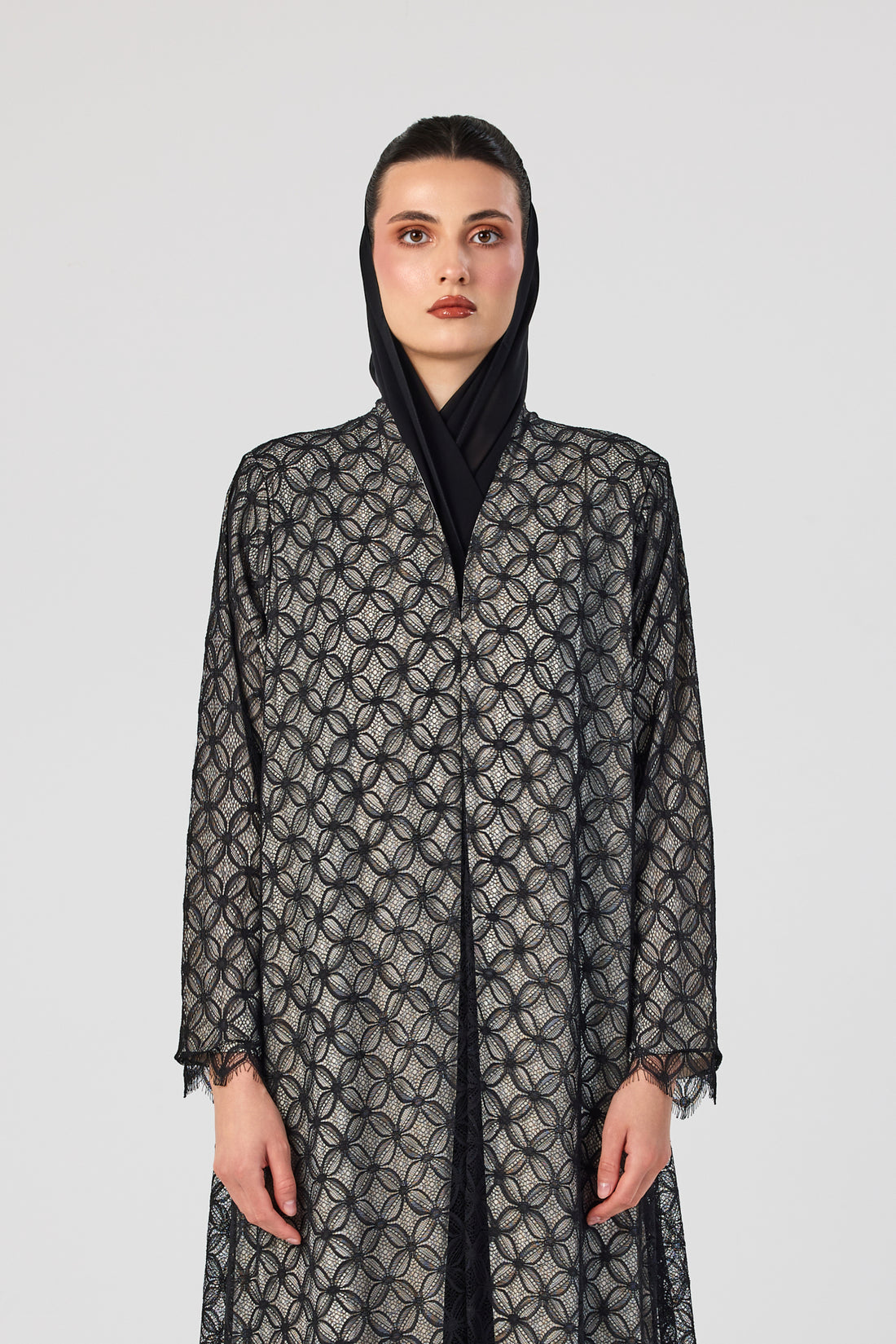 Chic black lace abaya with a beige lining for a refined, contrasting look.