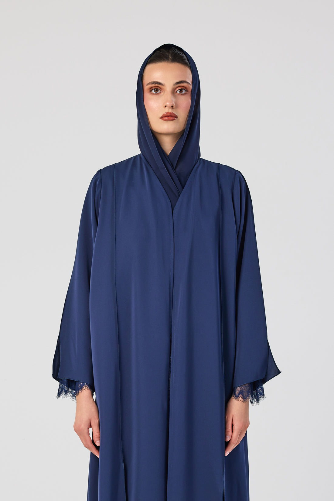 Chic navy abaya in Nada fabric with full inner navy lace and delicate lace-trimmed sleeves....