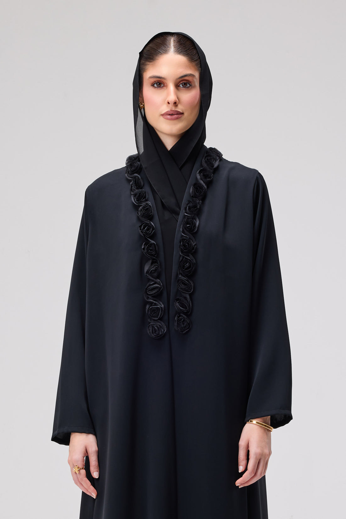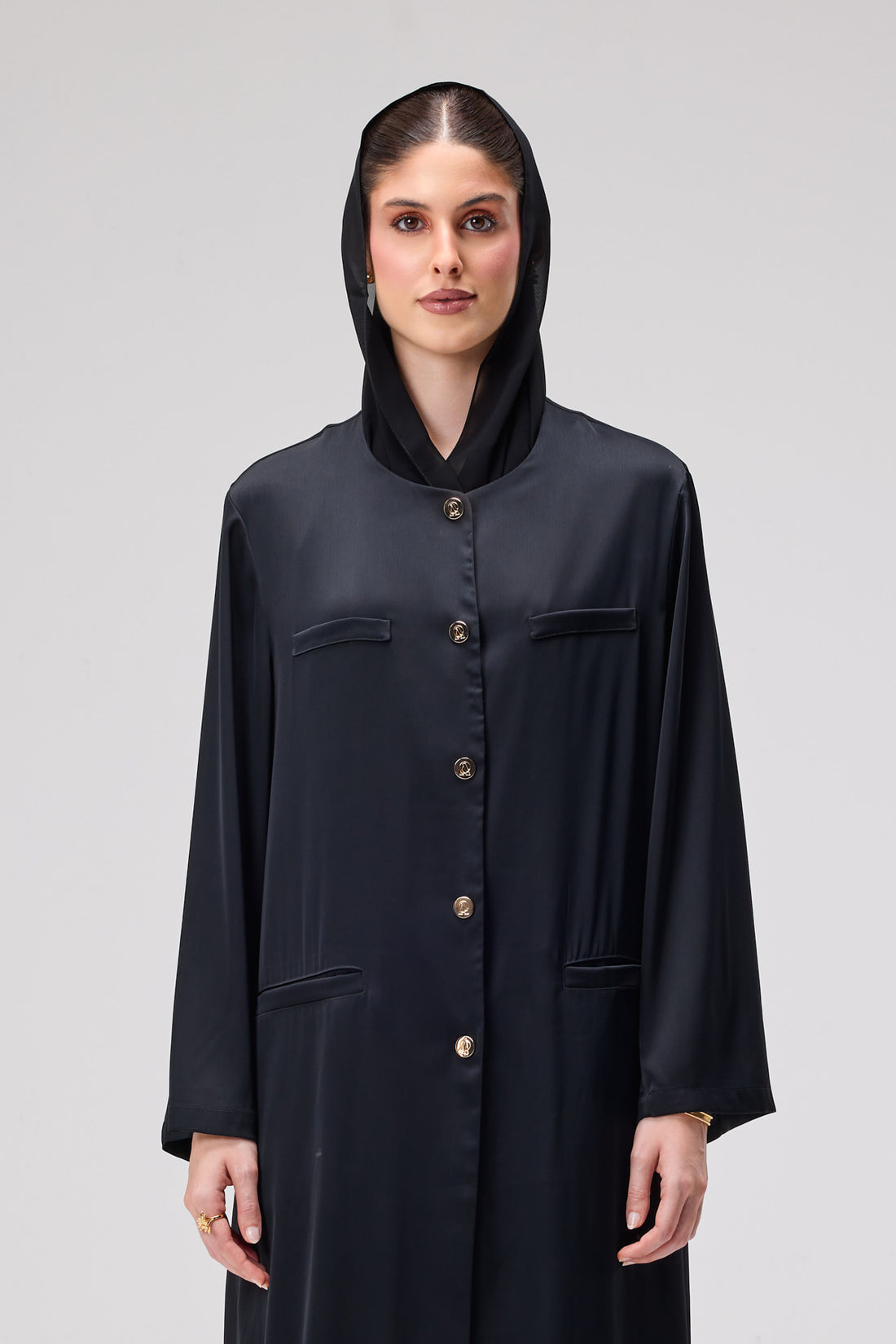 Soft satin abaya featuring customized buttons with brand’s icon.