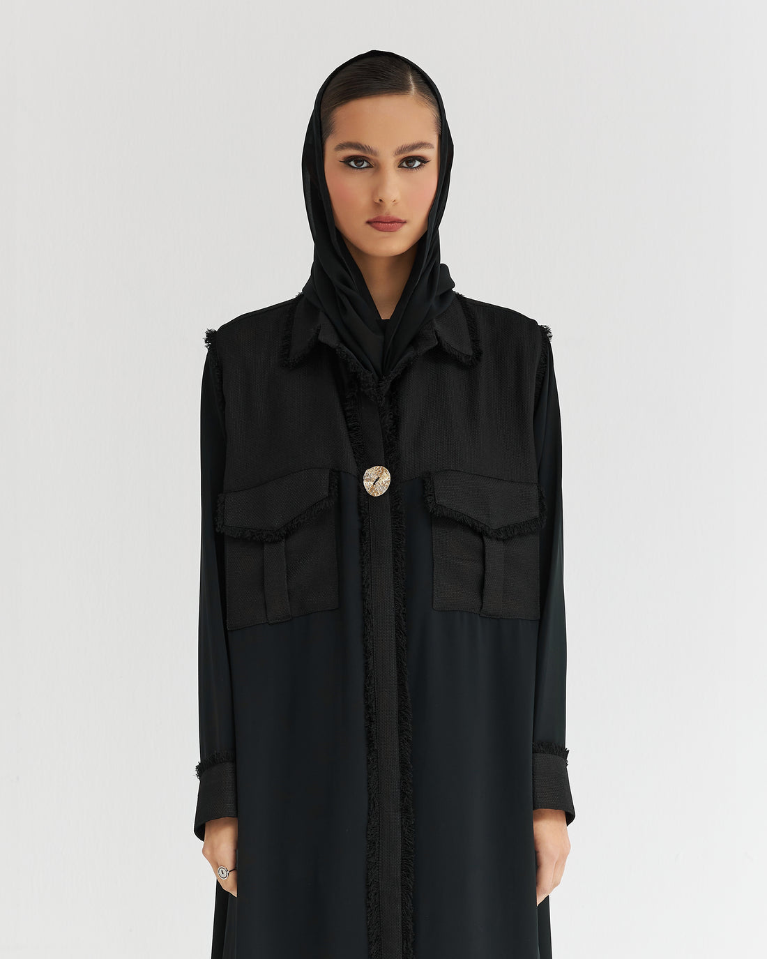 A formal fit inspired abaya with rope details on sleeves and borderline