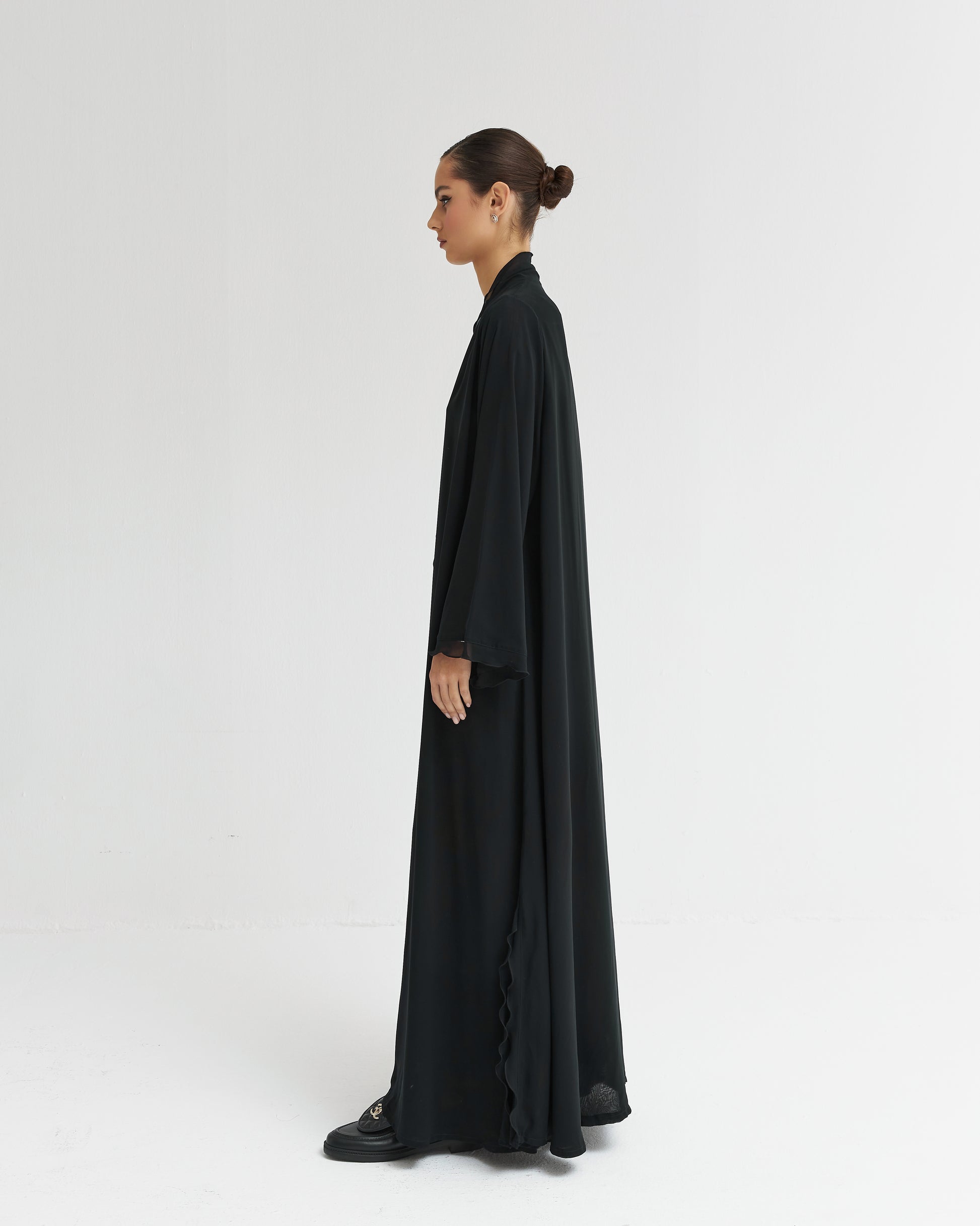 Our flow collection exquisite piece , flowy soft Black abaya with soft feminine ruffles on sleeves and edges