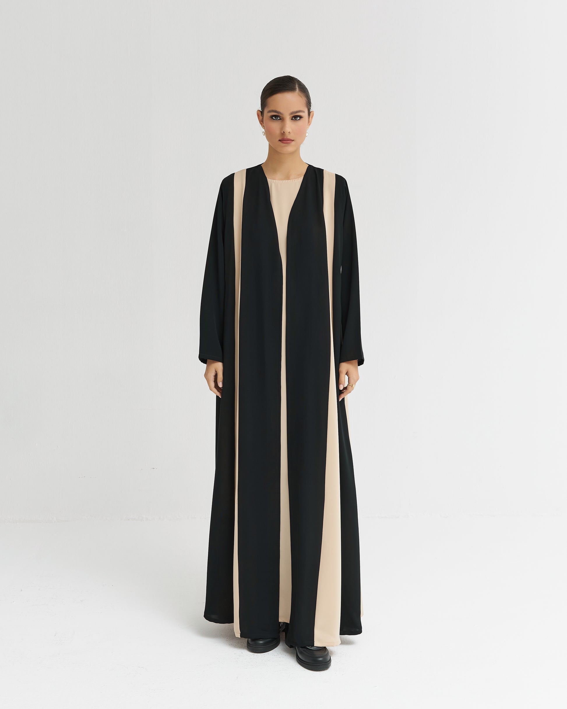 Flowy abaya in elegant vertical lines in Black & Beige to give the illusion of a taller and slimmer figure