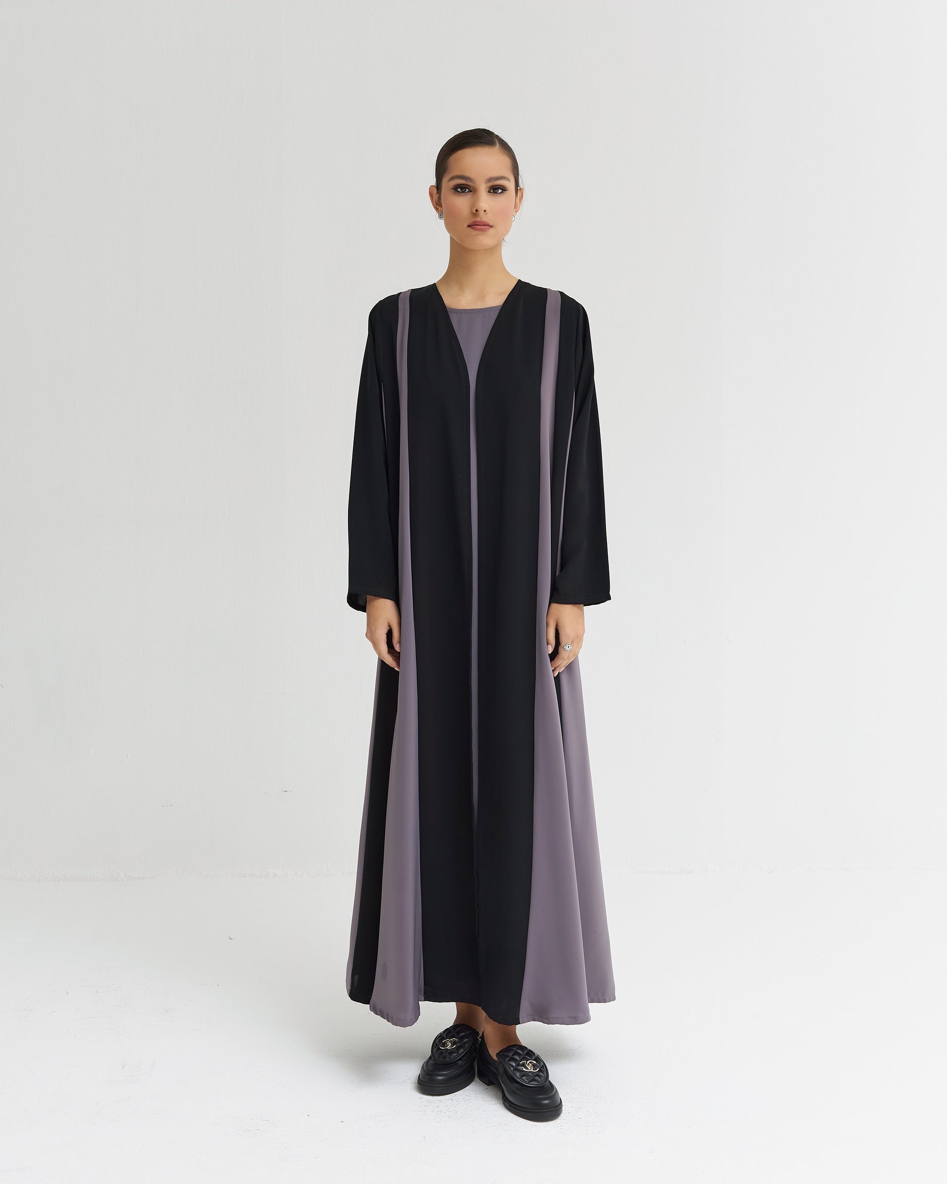 Flowy abaya in elegant vertical lines in Black & Grey to give the illusion of a taller and slimmer figure