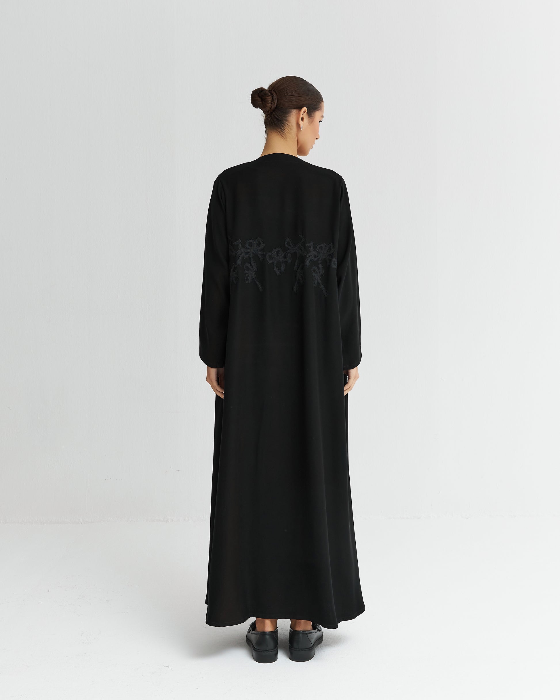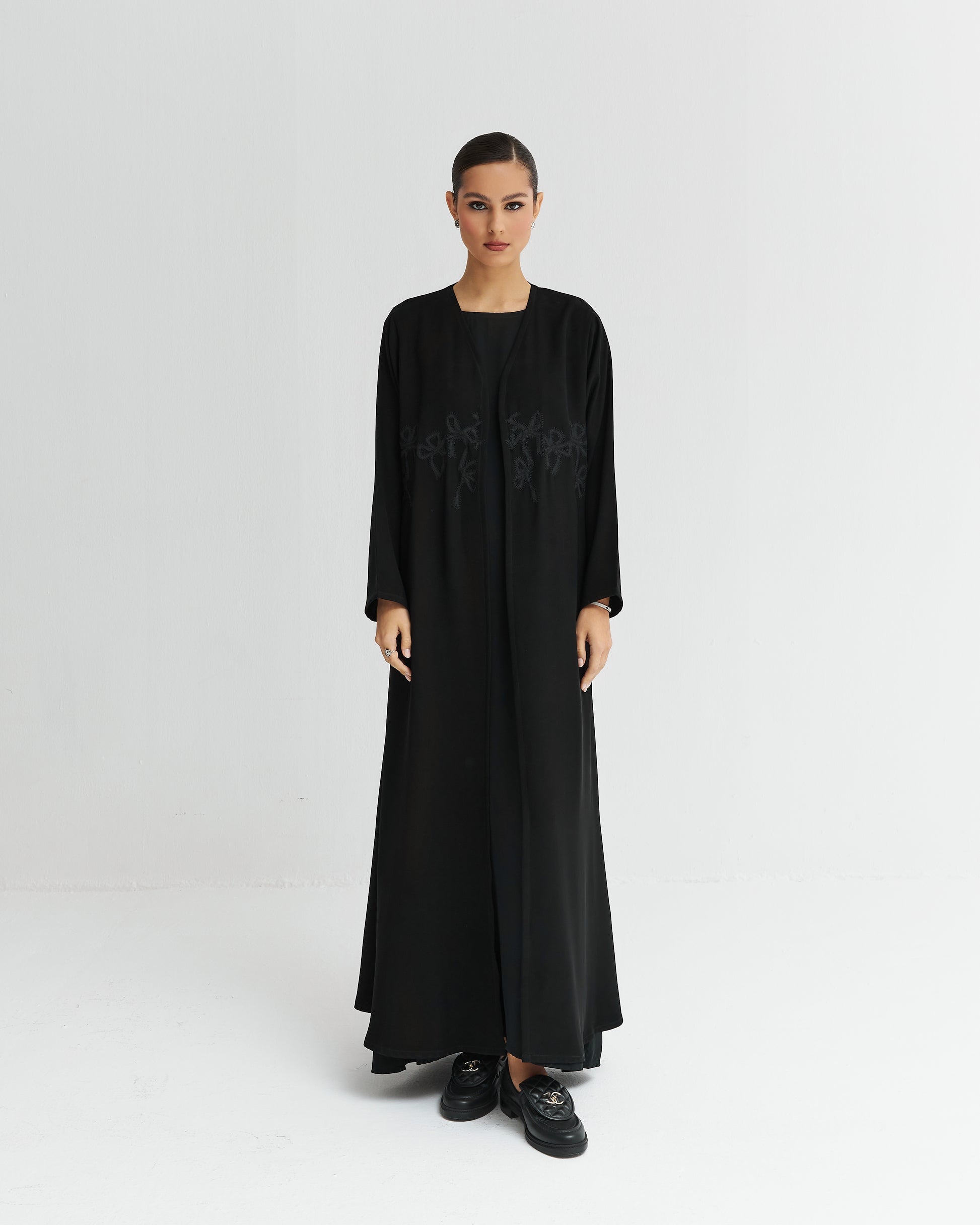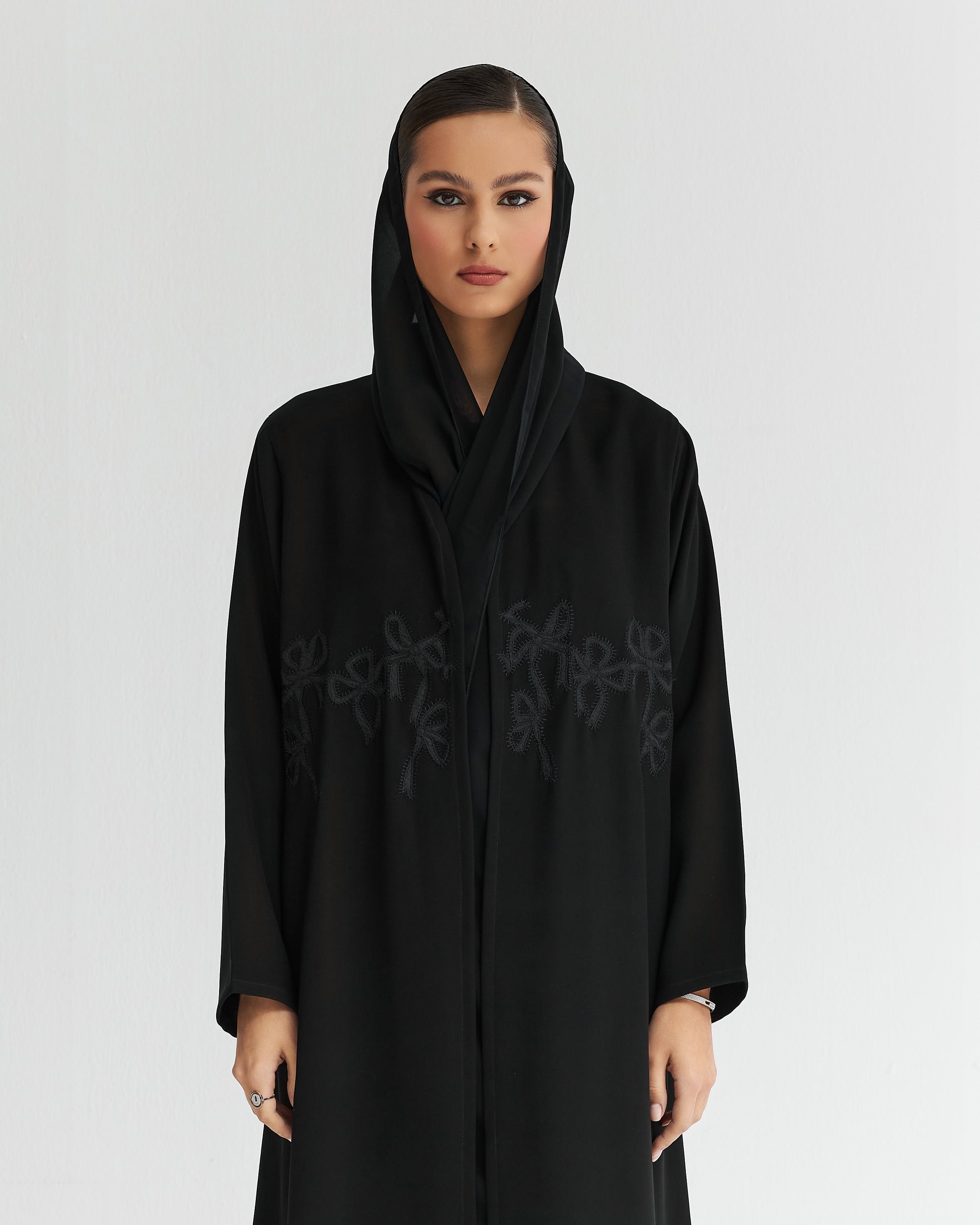 An elegant abaya with cursive ribbon embroidery using threads and delicate organza