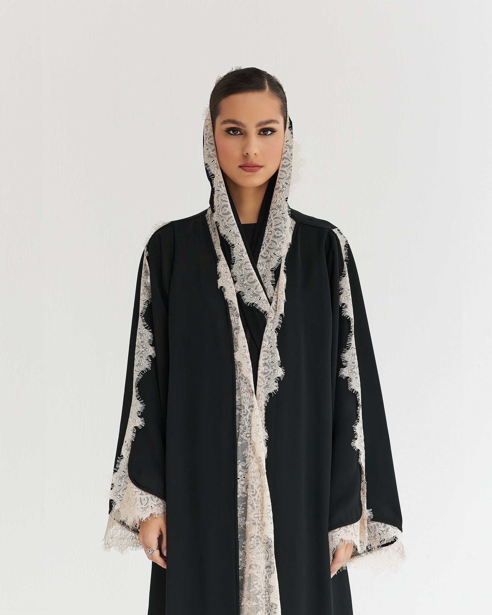 From our Daniel series capsule. Stylish high end luxury piece in a rich Black soft French beige dantelle color