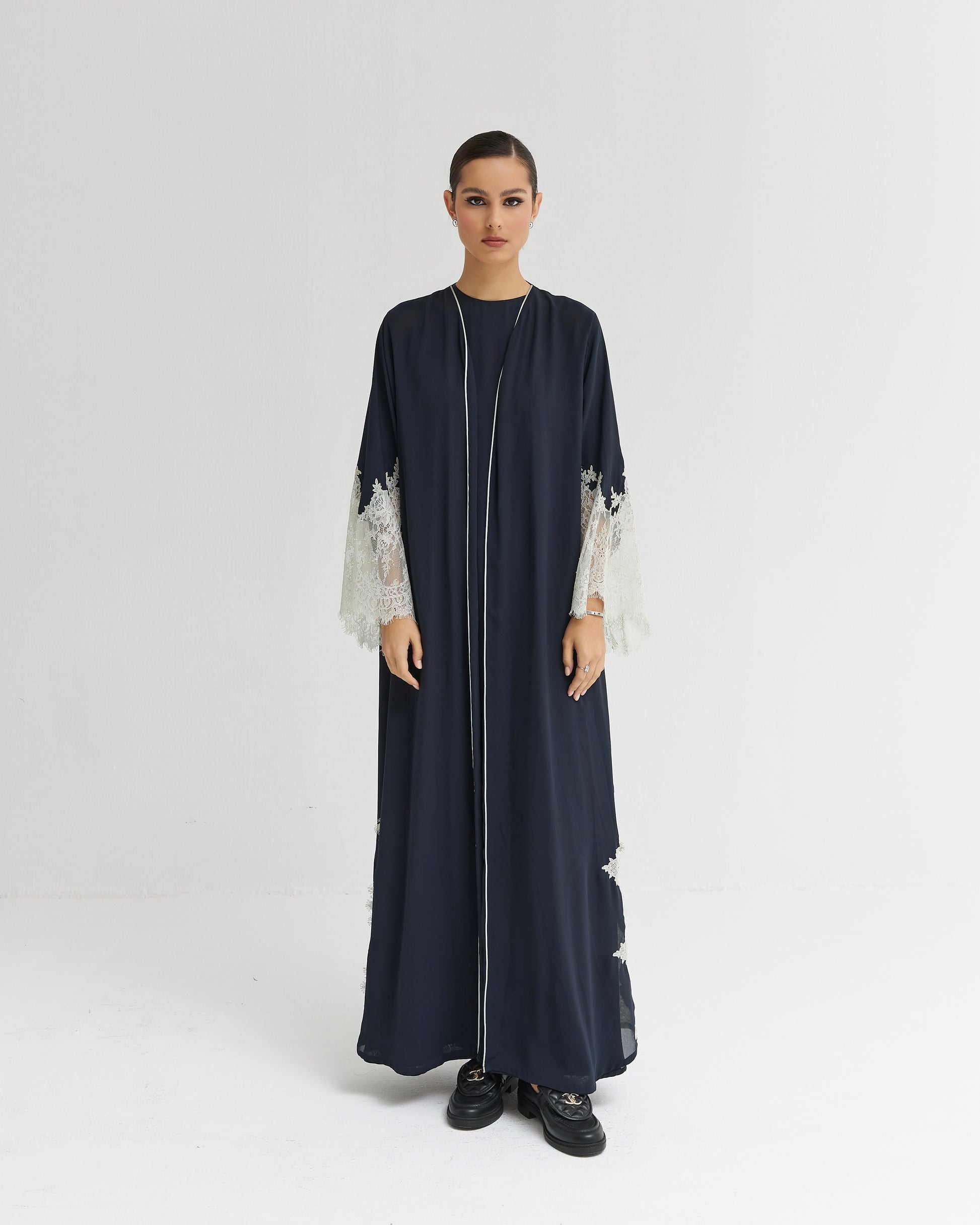 Buttery flowy navy blue fabric matched with rich French light weight dusty pistachio dantelle . Very feminine and soft