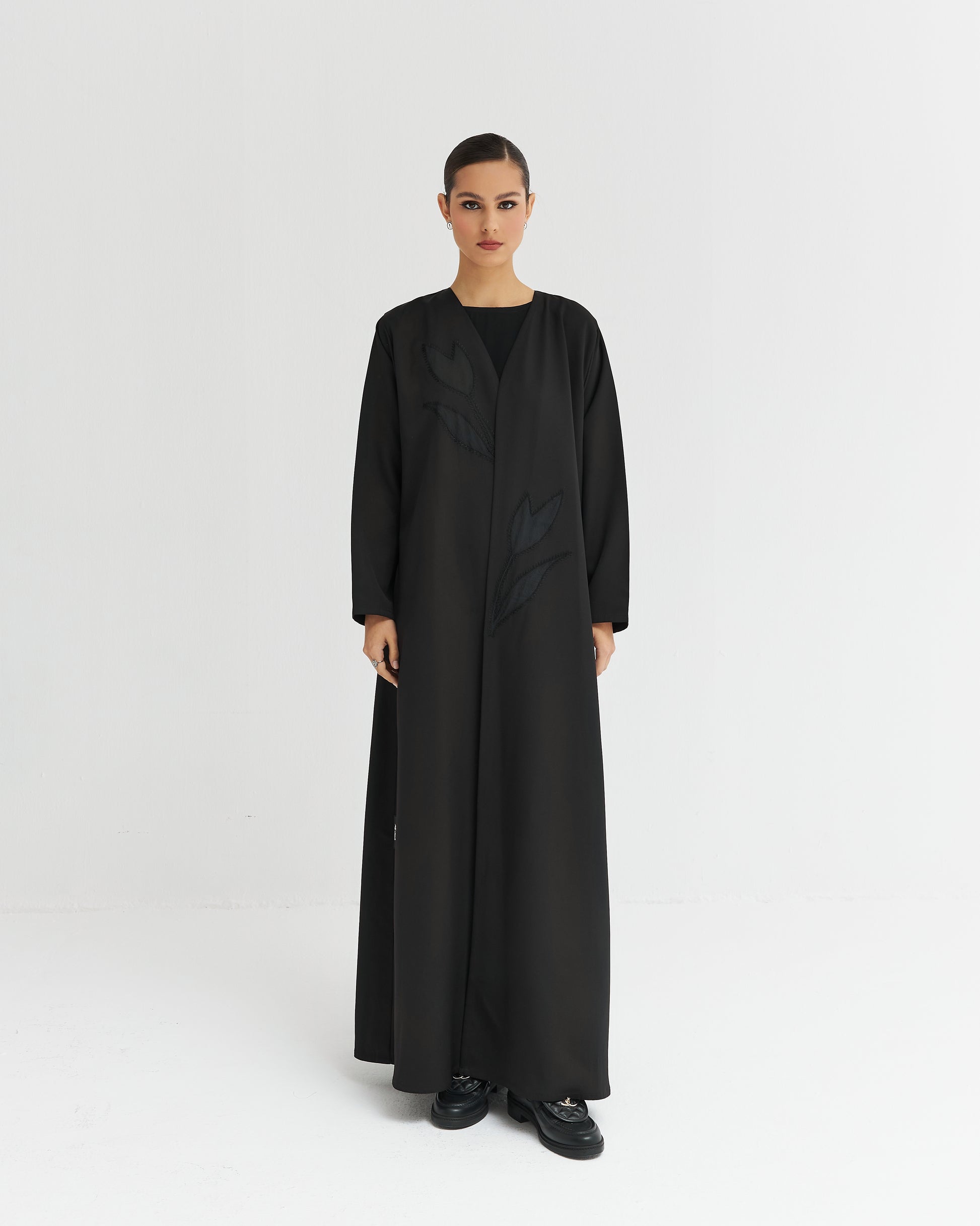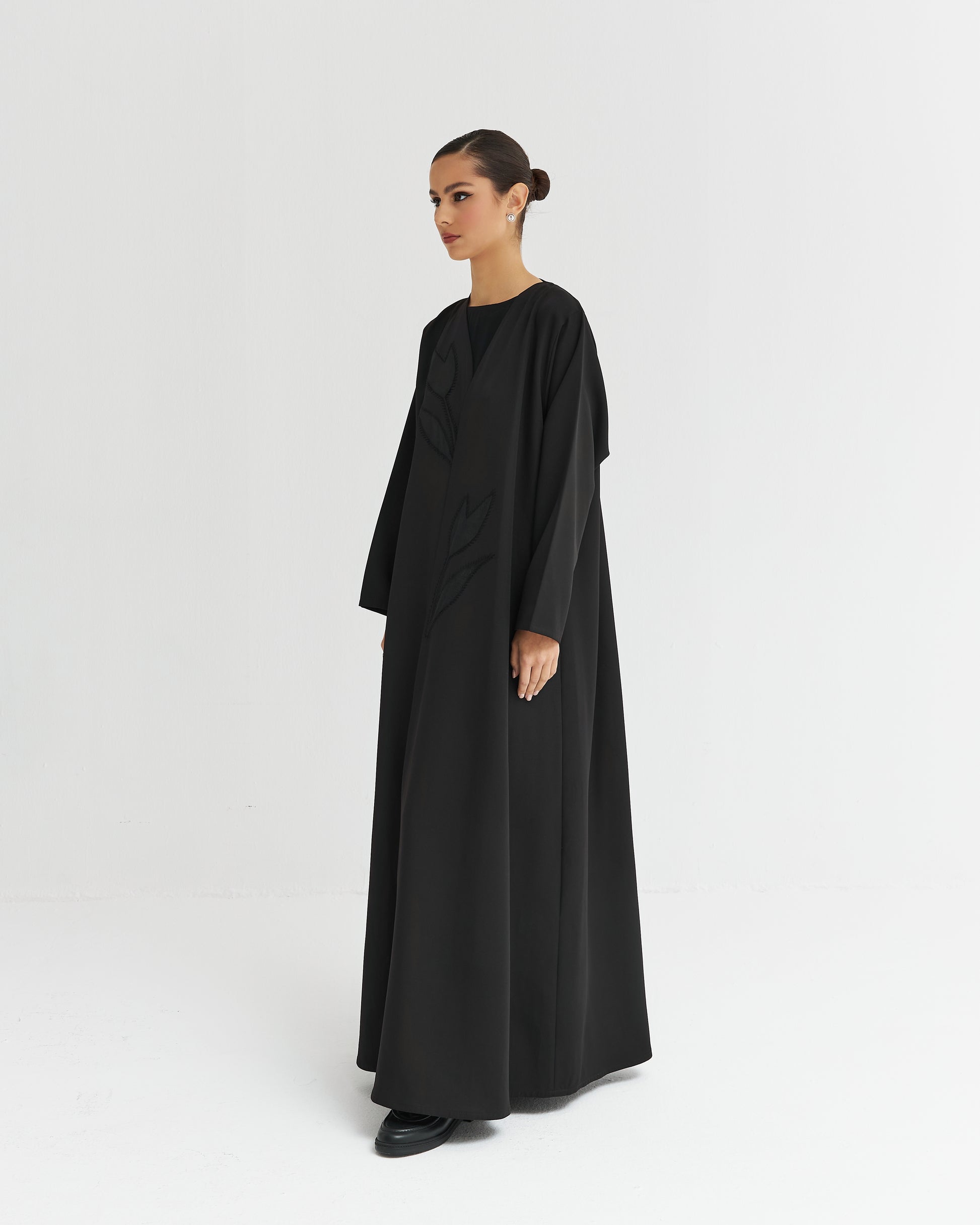 Elegant abaya featuring hand embroidered tulip silhouettes .