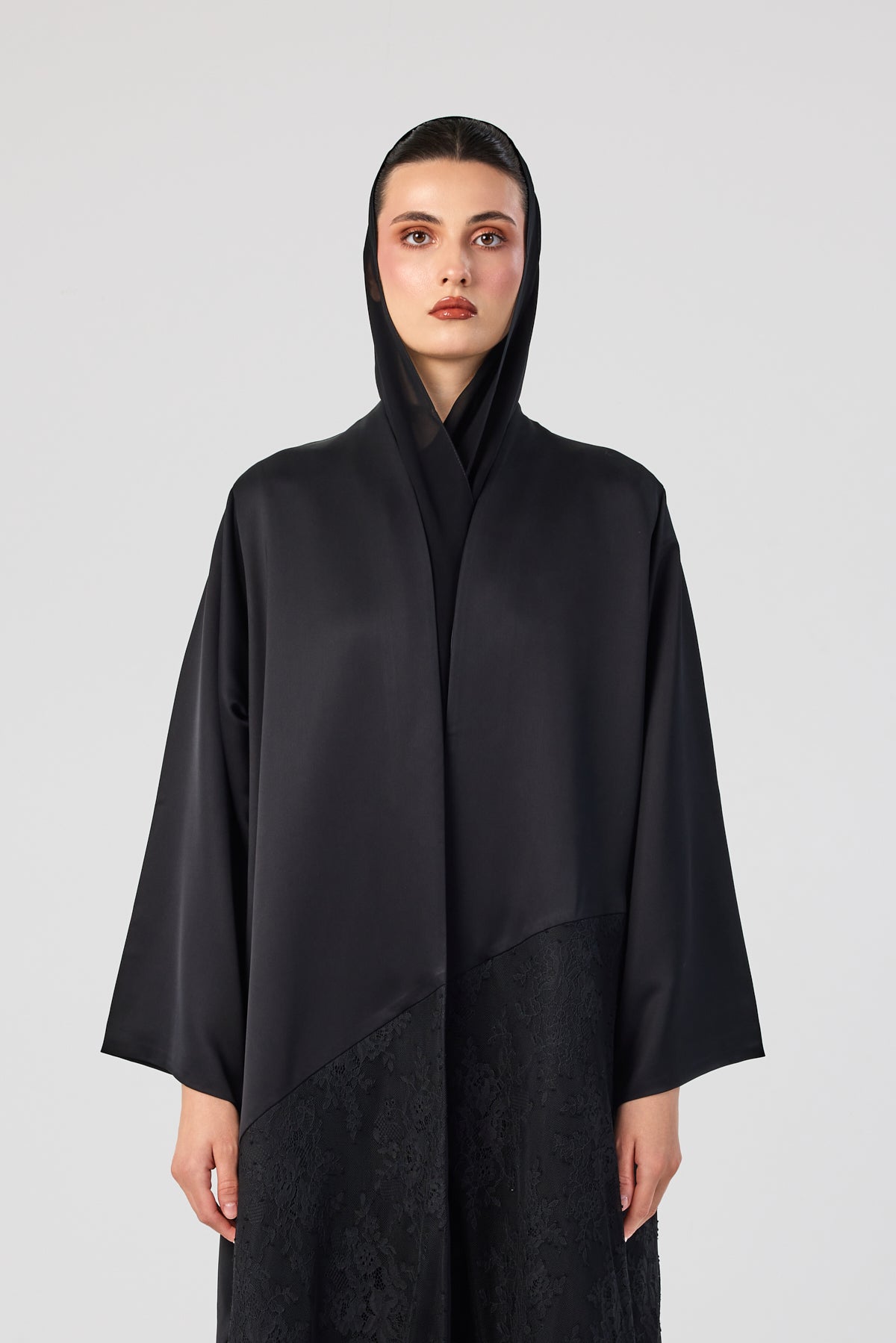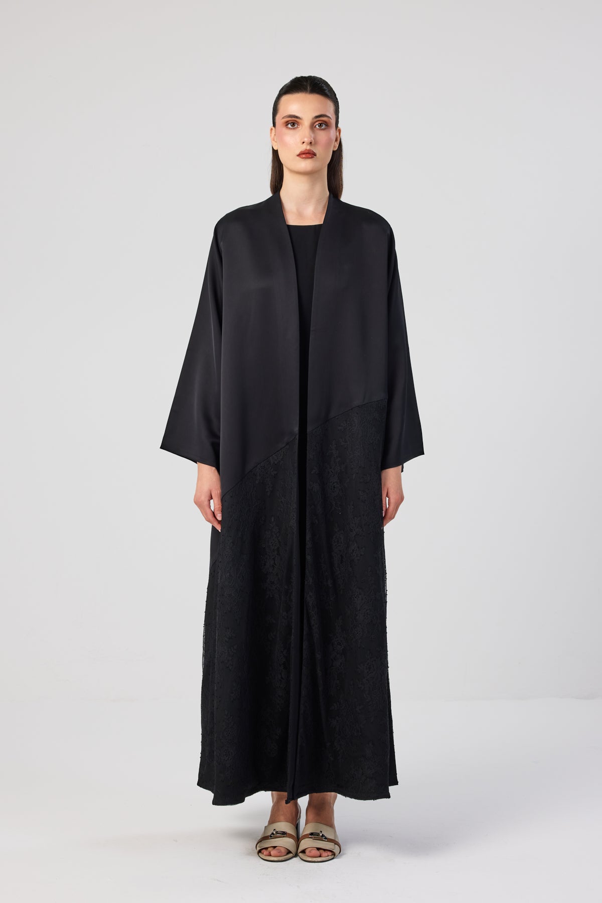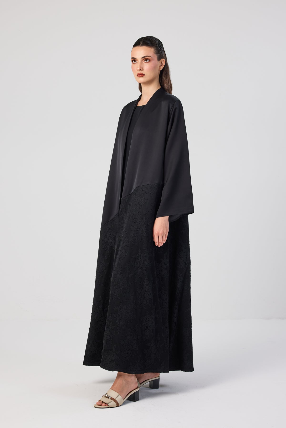 Special-occasion black abaya in Italian crepe with black lace detailing along the lower part.