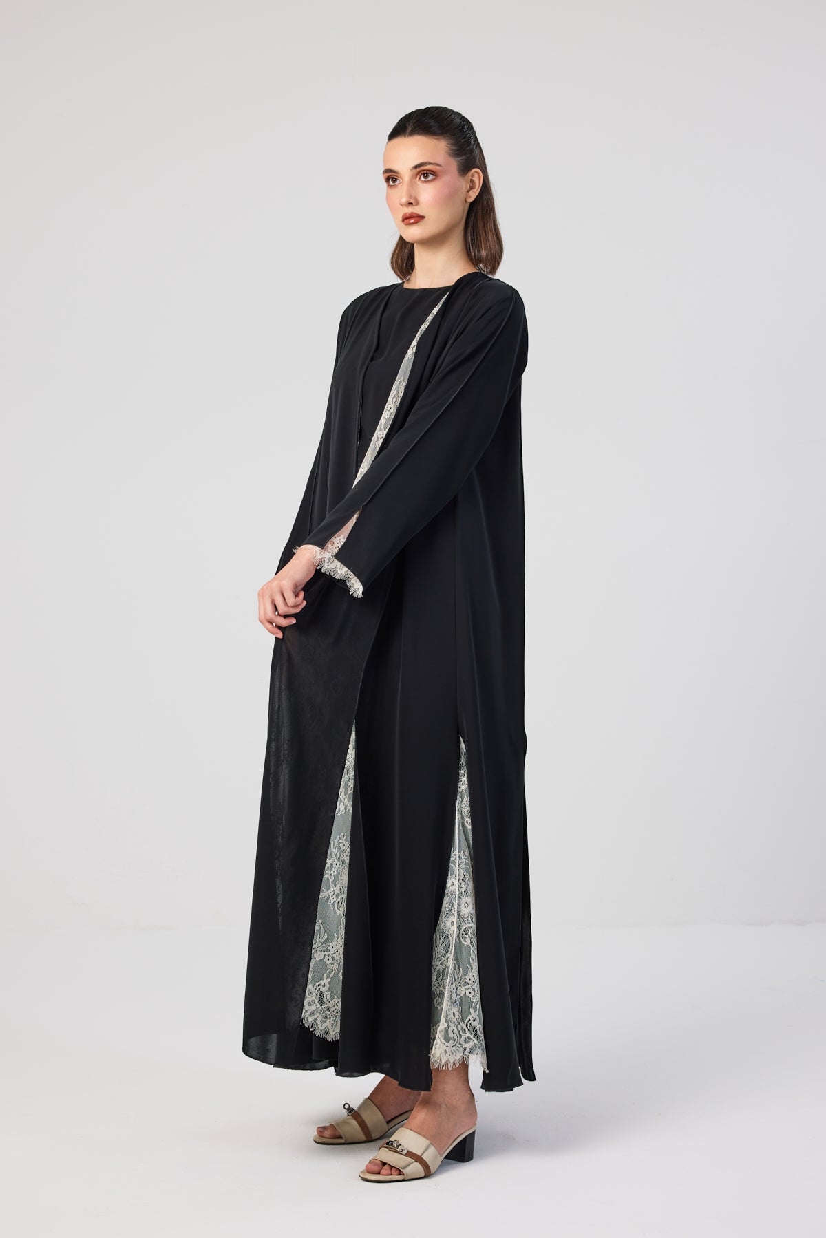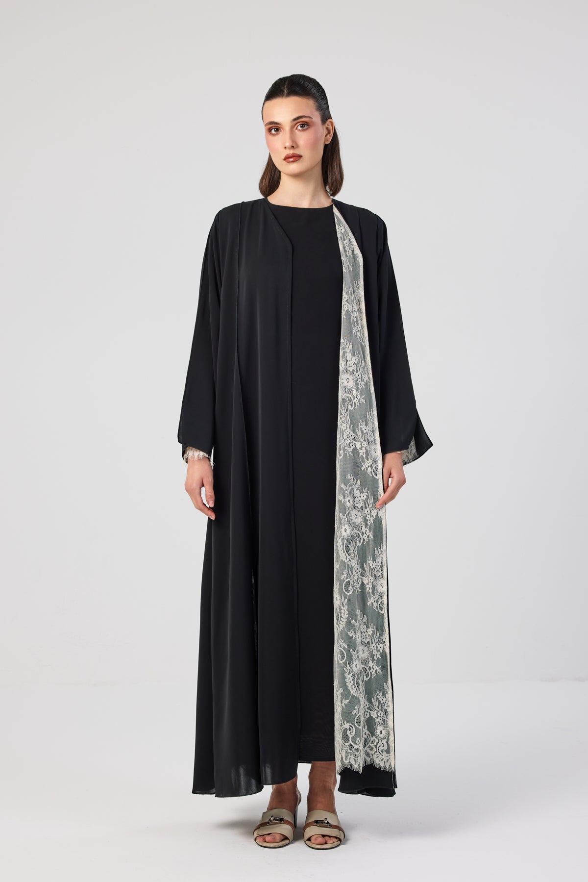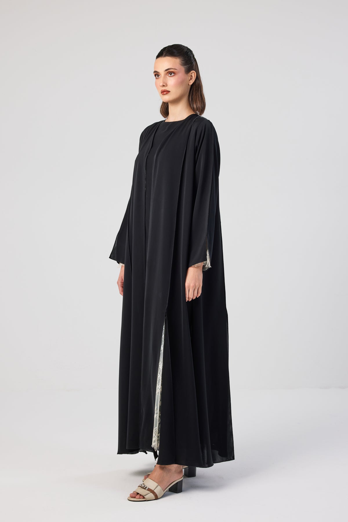 Distinctive black abaya in Nada fabric with full inner white lace and delicate lace-trimmed sleeves.