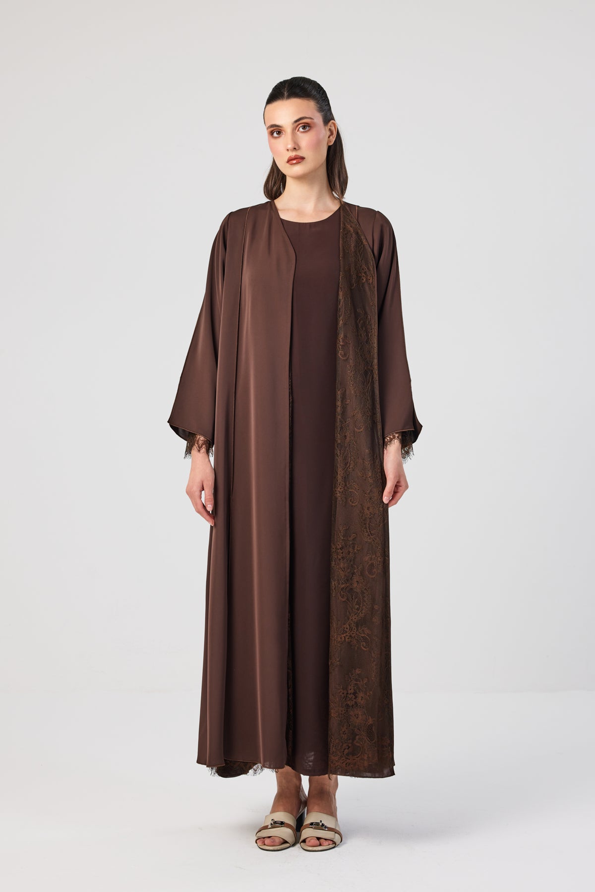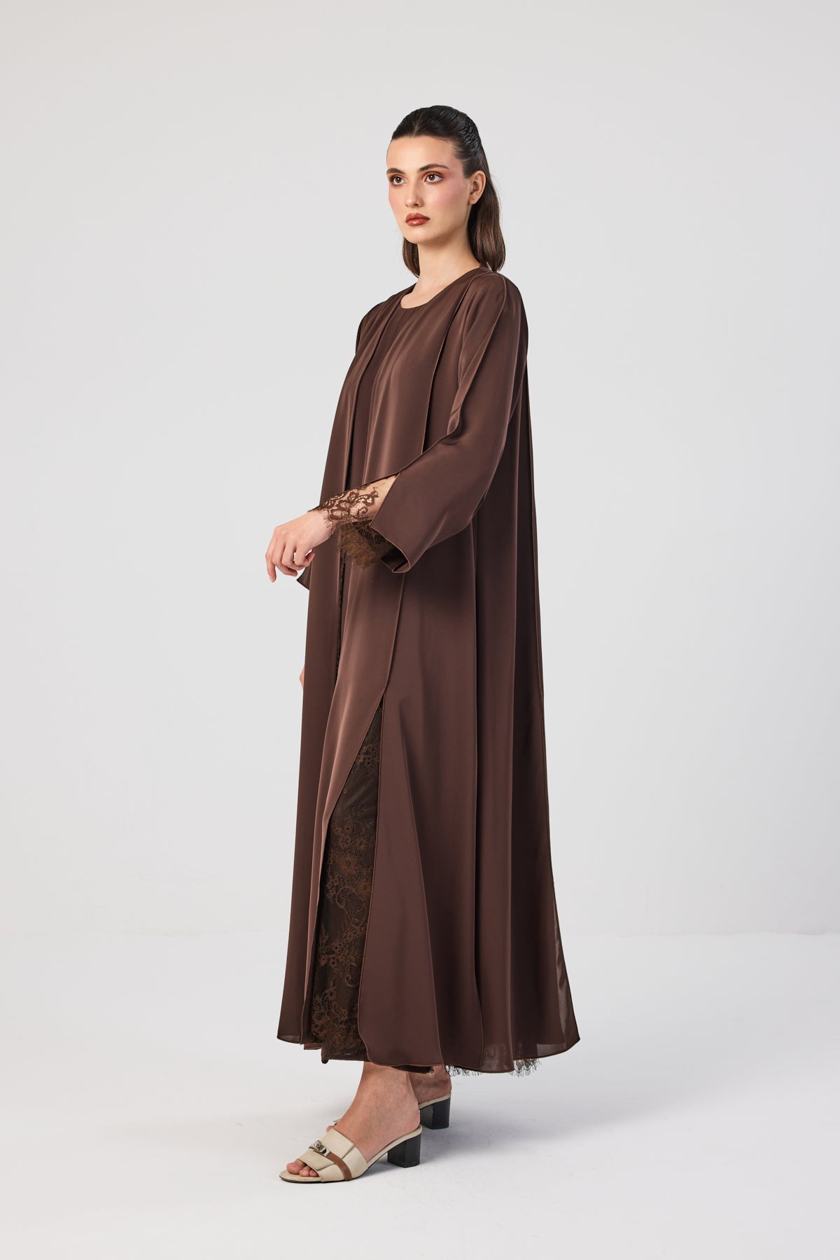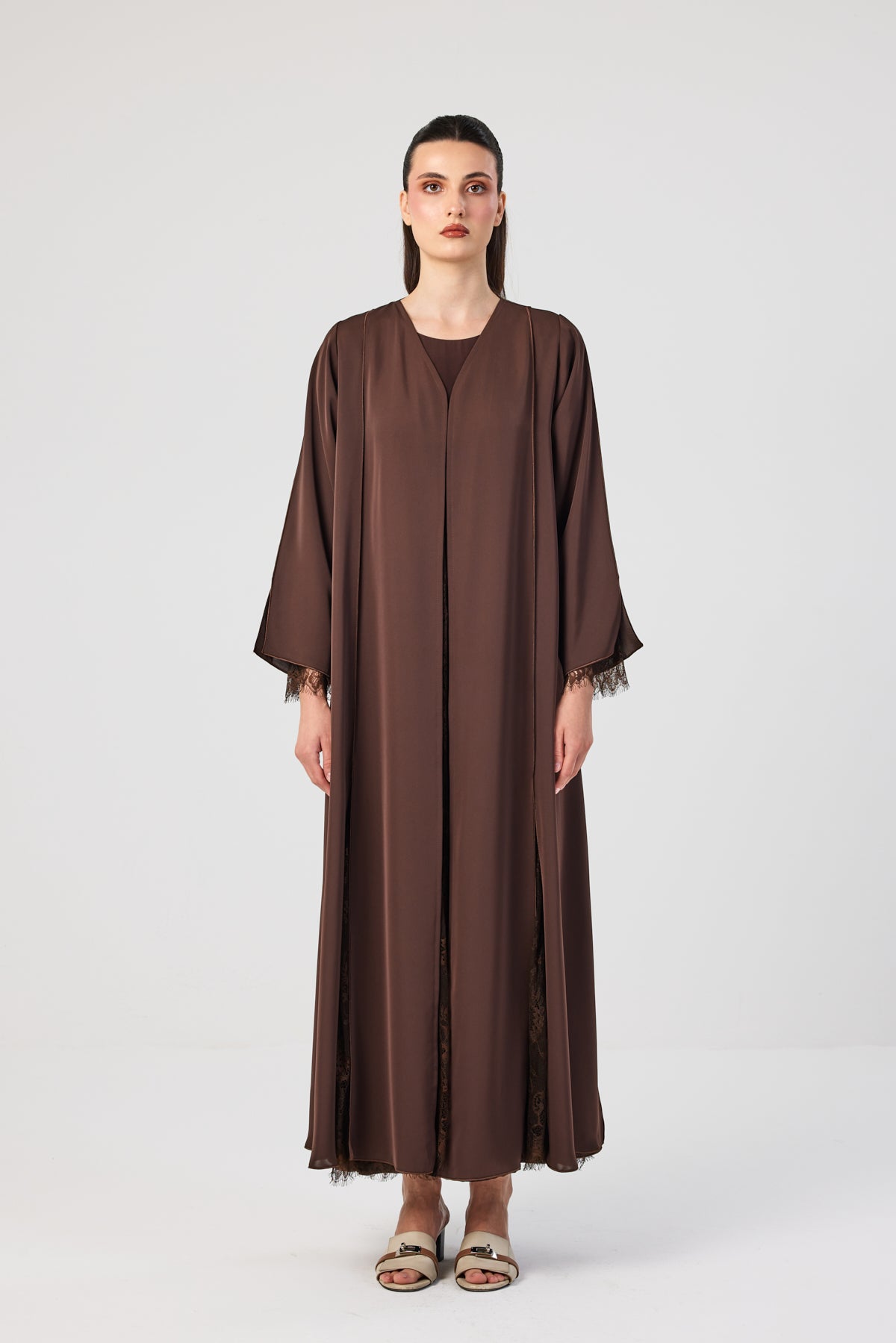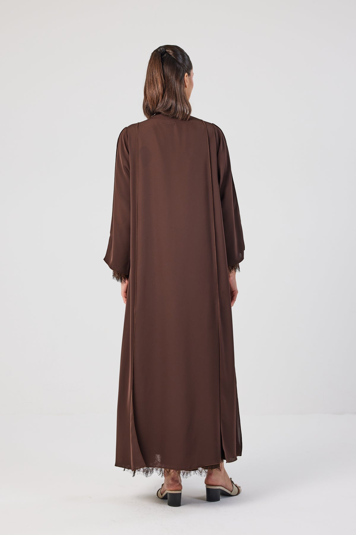 Distinctive brown abaya in Nada fabric with full inner brown lace and delicate lace-trimmed sleeves.