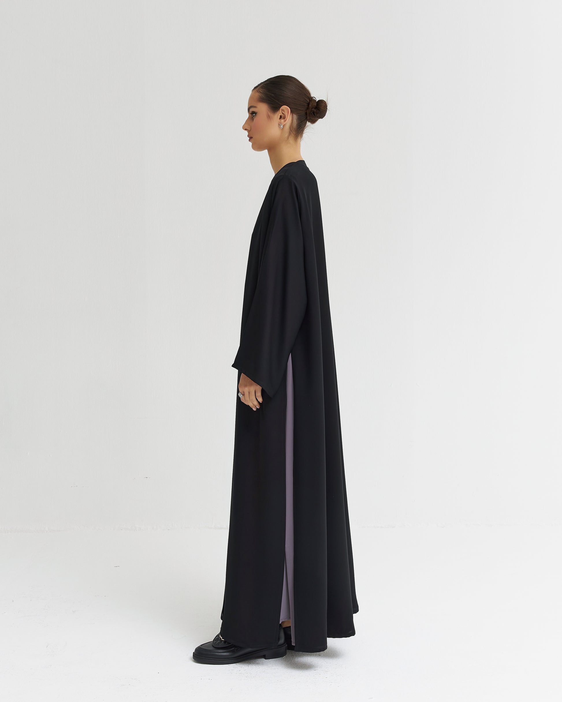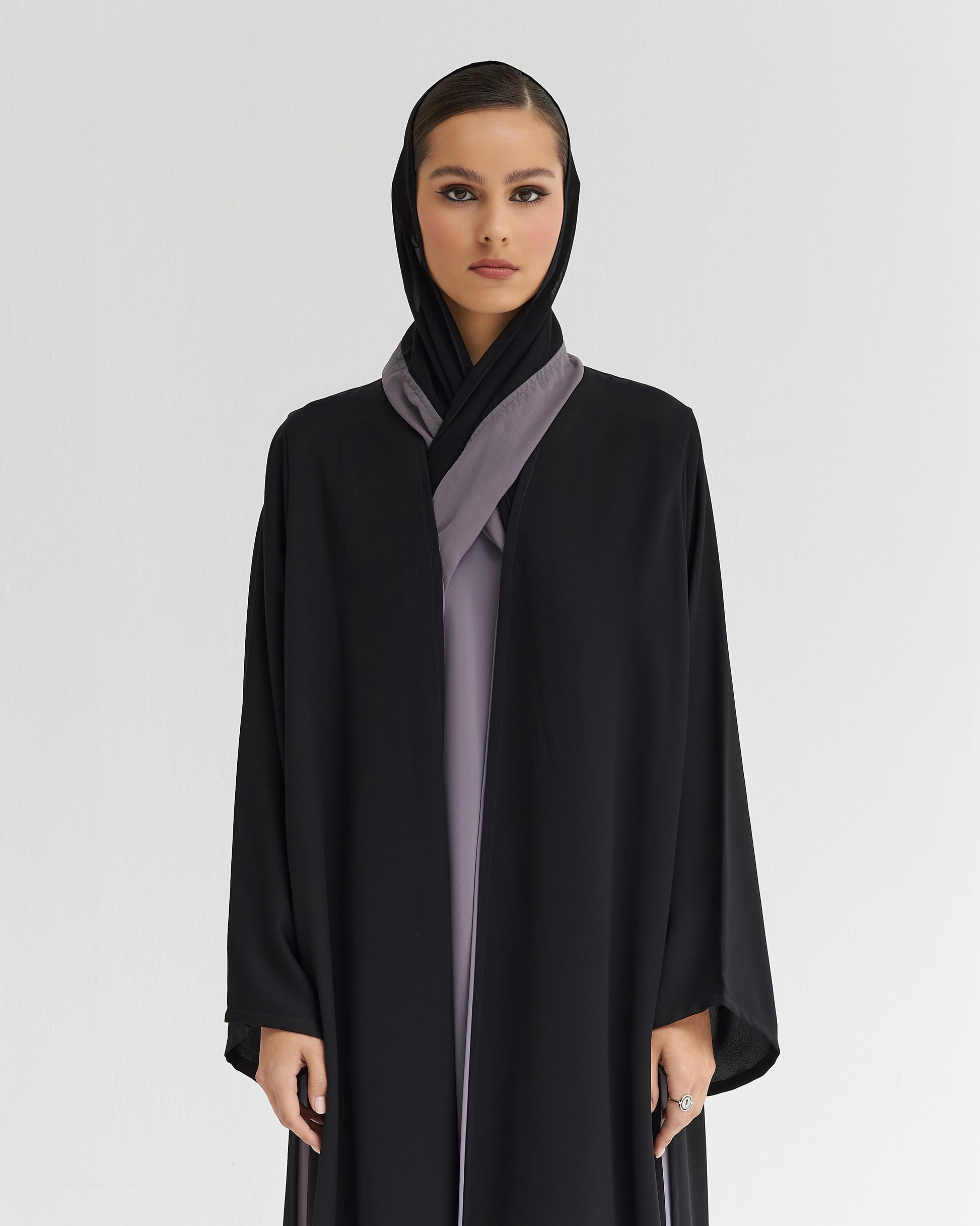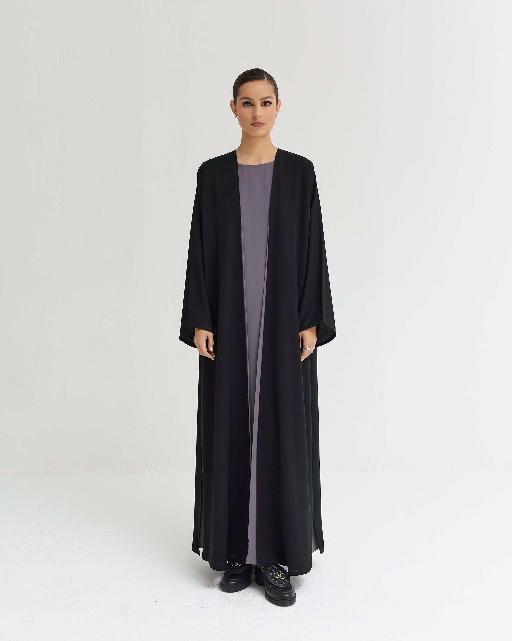 Two layered elegant abaya with side slit . Suitable for everyday and everywhere use .