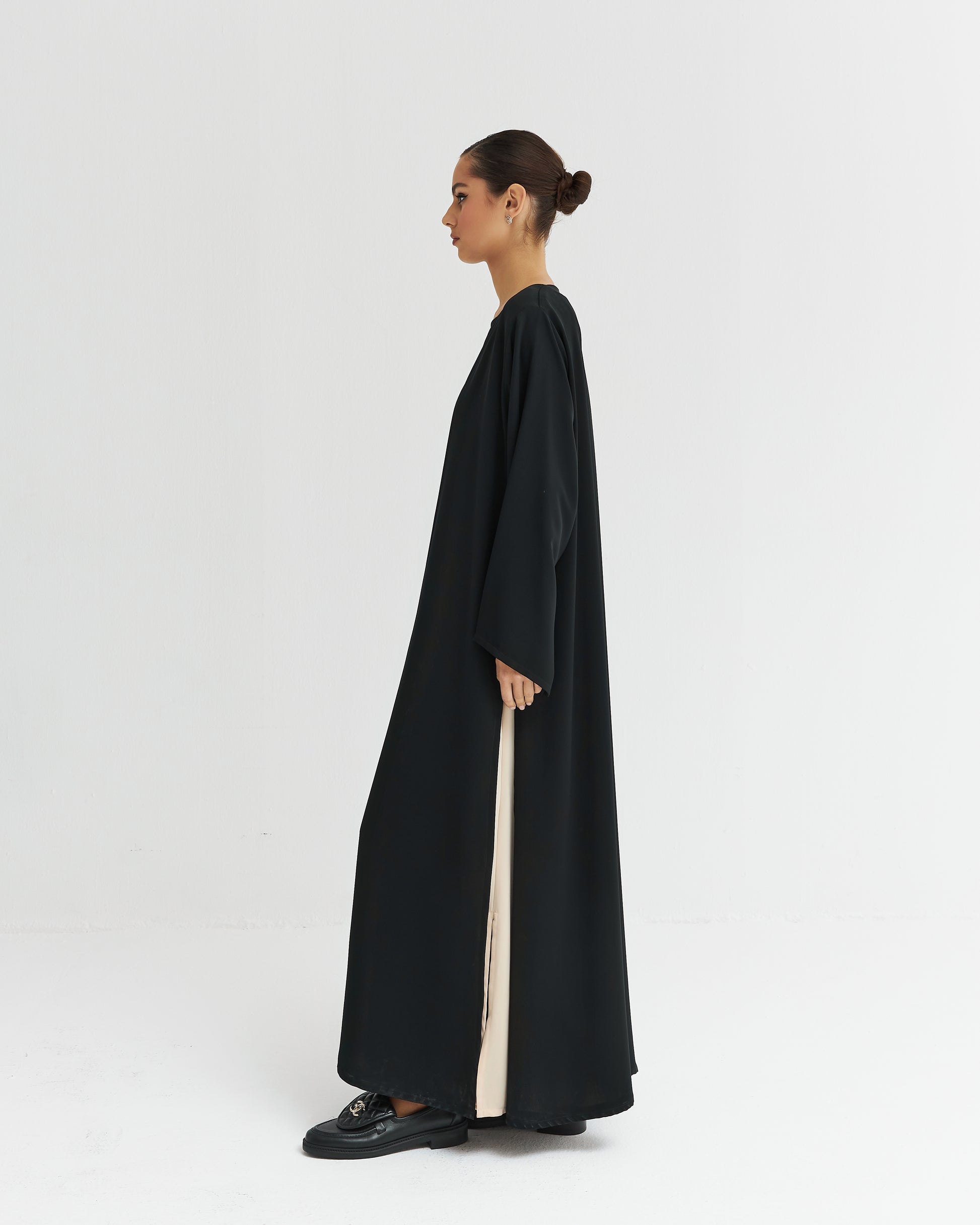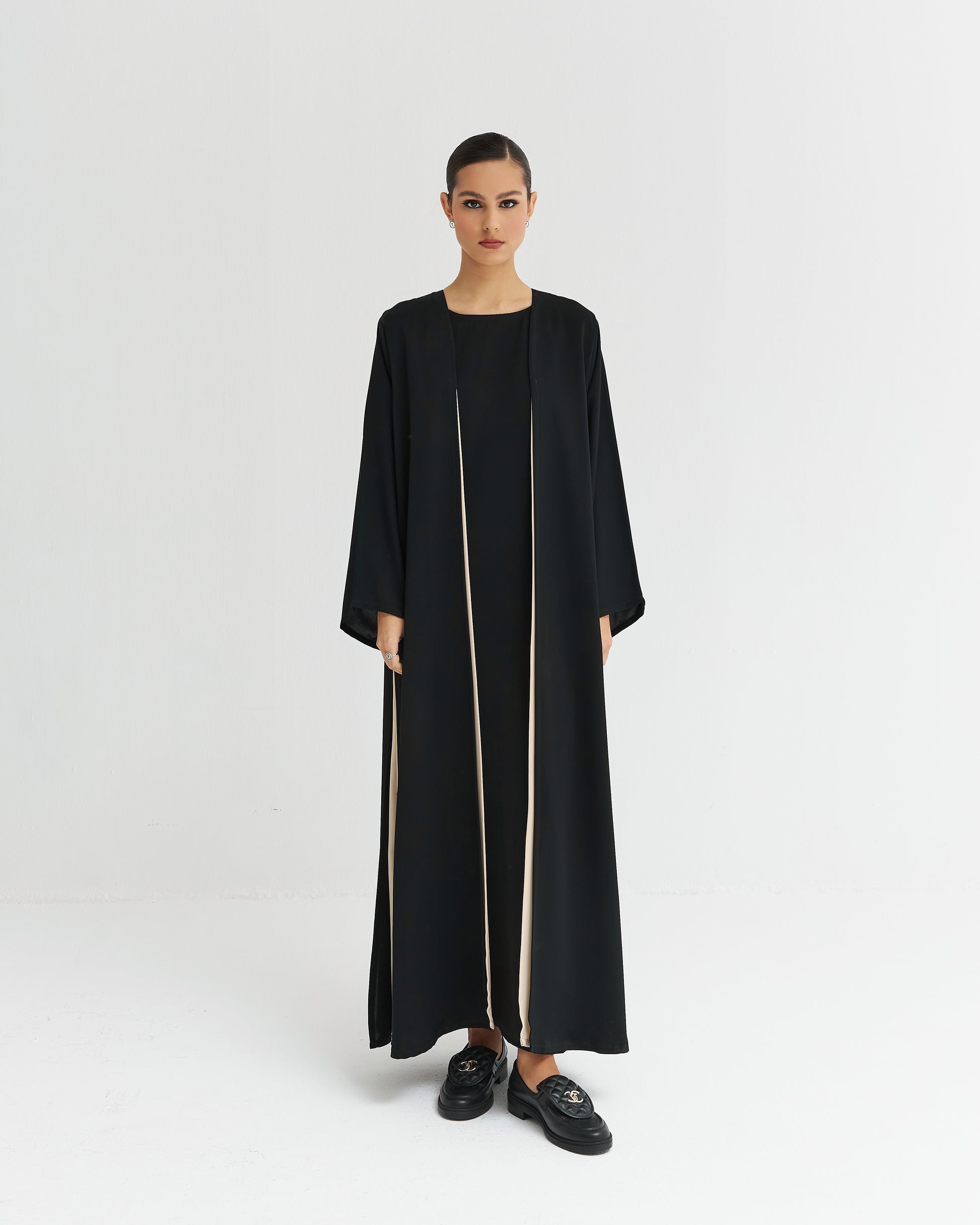 Two layered elegant abaya with side slit . Suitable for everyday and everywhere use .