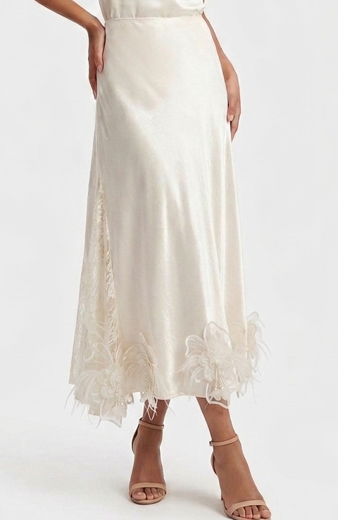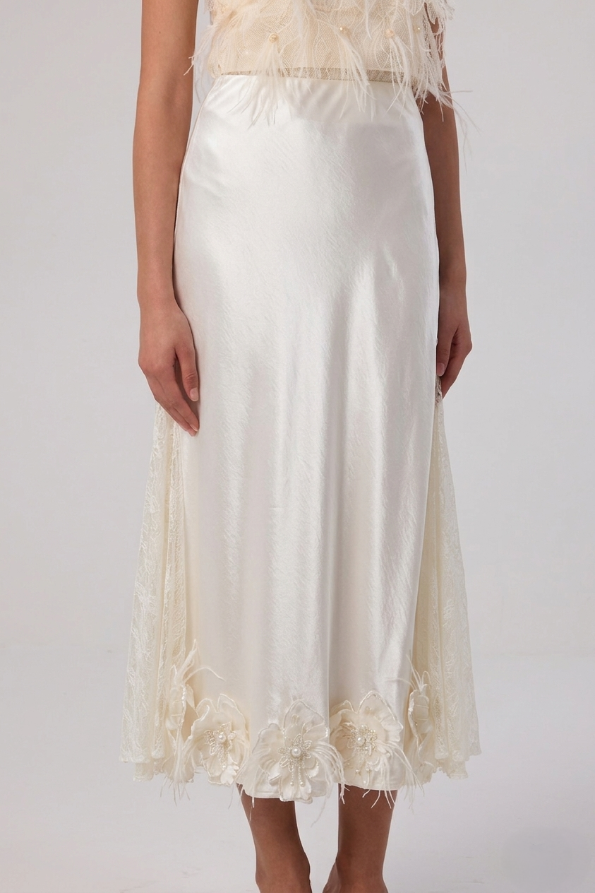 Soft statement off-white silk skirt with 3D floral detailing and feather accents for a delicate, feminine look.