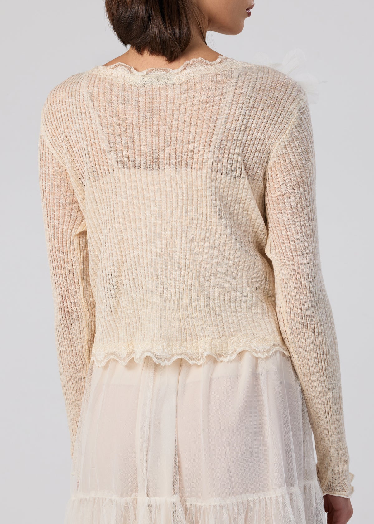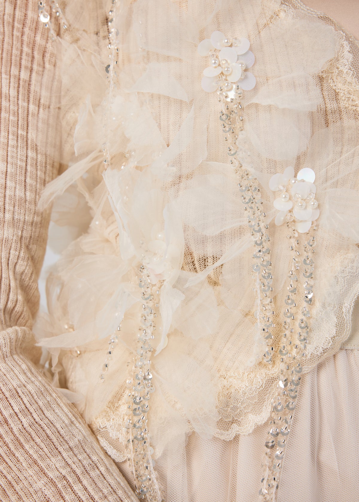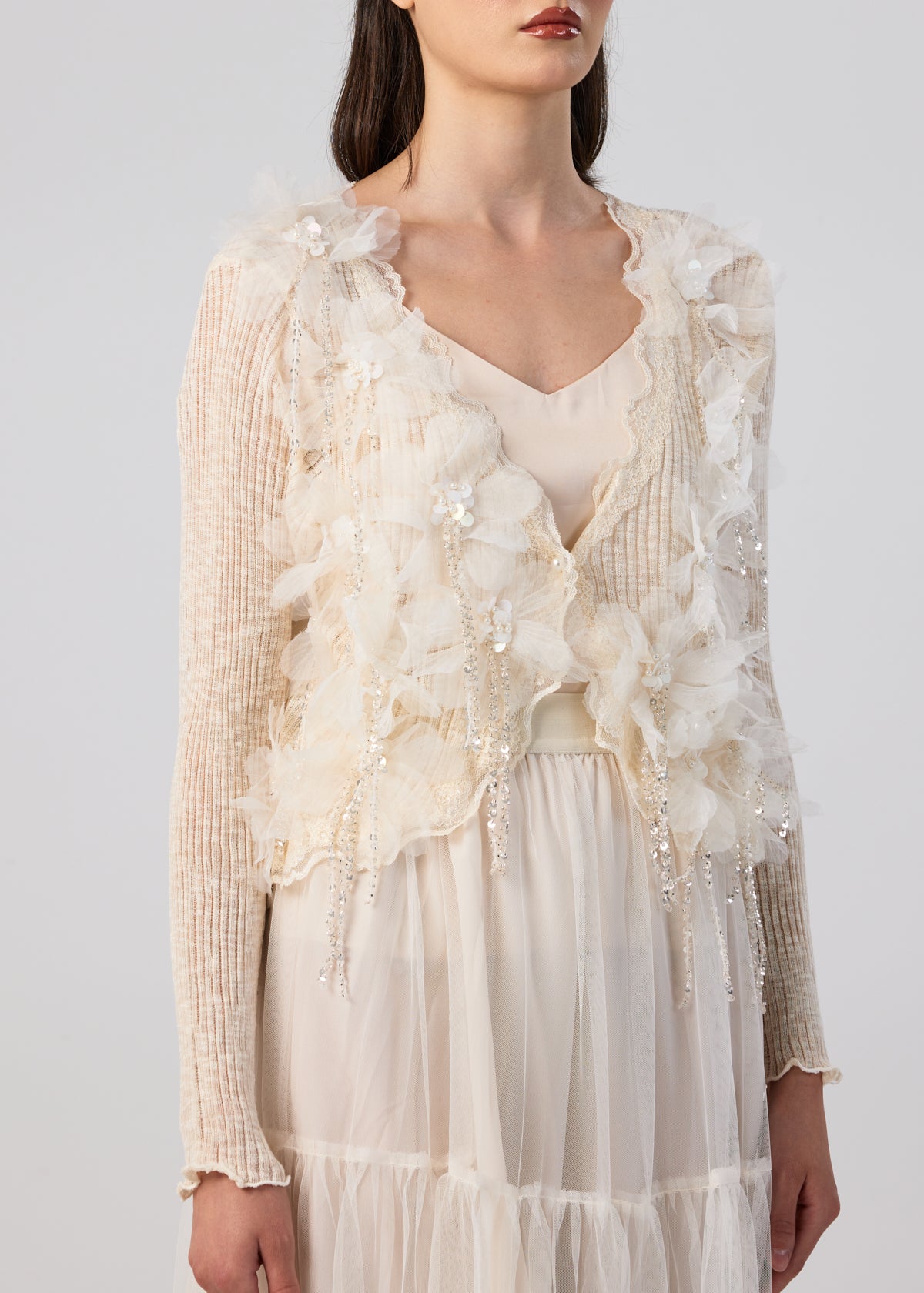 Refined cream top with 3D floral detailing and subtle sparkles for a graceful, feminine look.