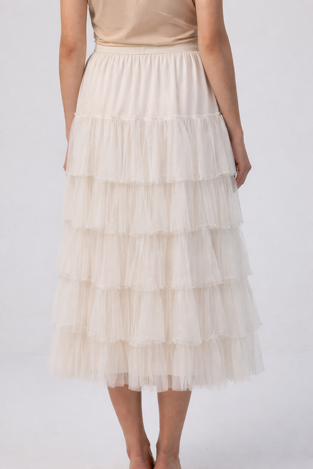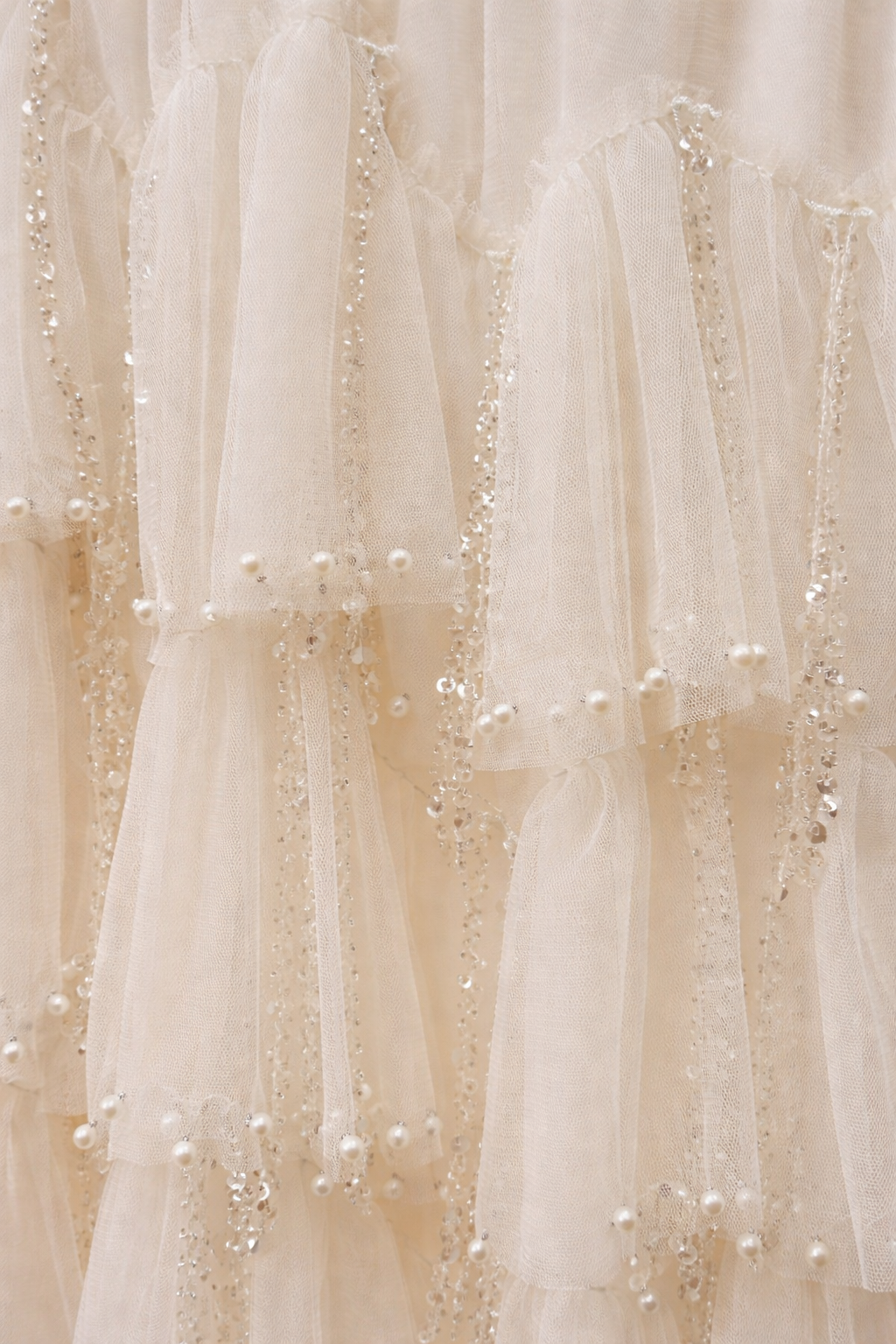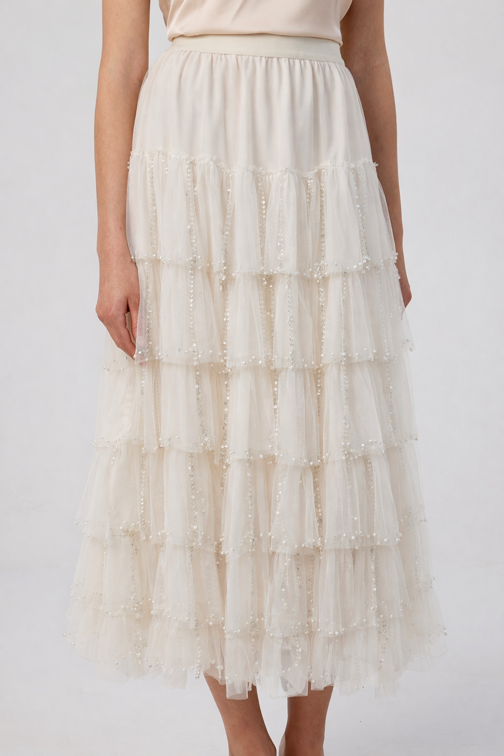 Graceful off-white skirt with layered tulle and delicate pearl detailing for a soft, voluminous look.